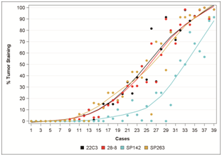 從階段Ⅰ的數(shù)據(jù)來(lái)看,四種檢測(cè)方法中,28-8、22C3和SP263在腫瘤染色方面一致性較好,唯有SP142是個(gè)例外;在四種方法中,免疫細(xì)胞上PD-L1的表達(dá)較之腫瘤細(xì)胞上的表達(dá)差異性更大(參見(jiàn)圖1和2);依然有36.9%的病例表現(xiàn)出不一致的結(jié)果。免疫組化依然作為檢測(cè)PD-L1蛋白表達(dá)的金標(biāo)準(zhǔn),鼓勵(lì)使用陽(yáng)性/陰性來(lái)定義PD-L1的表達(dá),但可能會(huì)朝向定義更加多元化的判定來(lái)替代單一的Cutoff值。